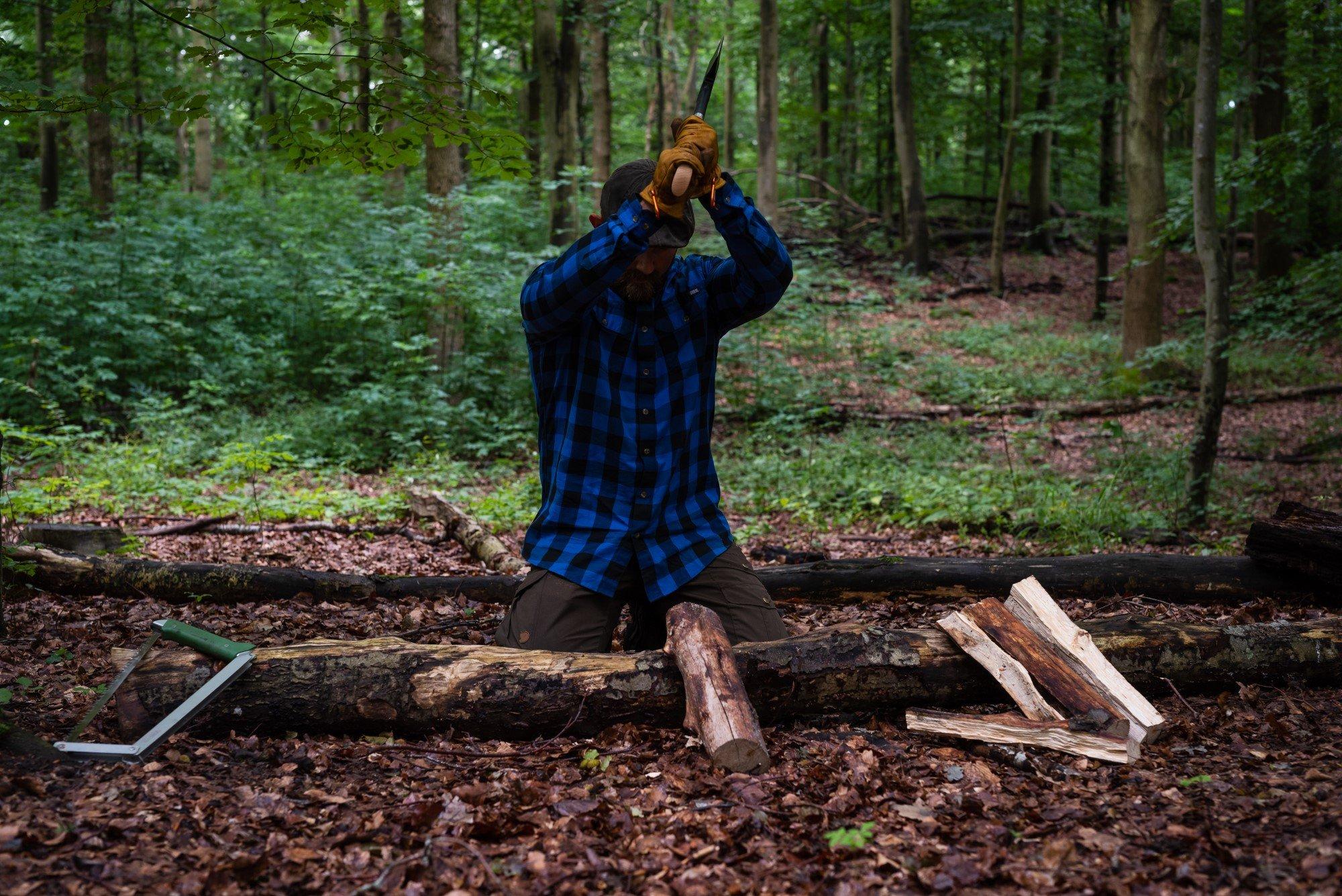 Ik begon de test door op zoek te gaan naar een geschikt stuk hout. Al snel vond ik een groot, stuk hout afkomstig van een es. Nadat ik het stuk in kleinere stukken had gehakt, kon de test pas echt beginnen. Ik leg altijd een stuk hout op een grote boomstronk en kniel ervoor. Bijlveiligheid 101: als ik het blok mis, zal ik altijd eerst de grond raken en niet mijn been. De kop van de Fiskars bijl is een stuk breder aan de bovenkant dan de kop van een traditionele Zweedse bijl. Dit aspect, gecombineerd met scherpe snede, zorgde ervoor dat de bijl gemakkelijk door de blokken es hout heen schoot. Het verbaasde mij hoe gemakkelijk het was en kon alleen maar glimlachen gedurende het hele proces. Ik heb dik stuk hout in stukken gehakt en aanmaakhout gemaakt met de Fiskars Norden; de bijl had nergens moeite mee. De bijl is vlijmscherp – dit is erg belangrijk voor bijlen in het algemeen en ook heel fijn, omdat het betekent dat je hem niet hoeft te slijpen.