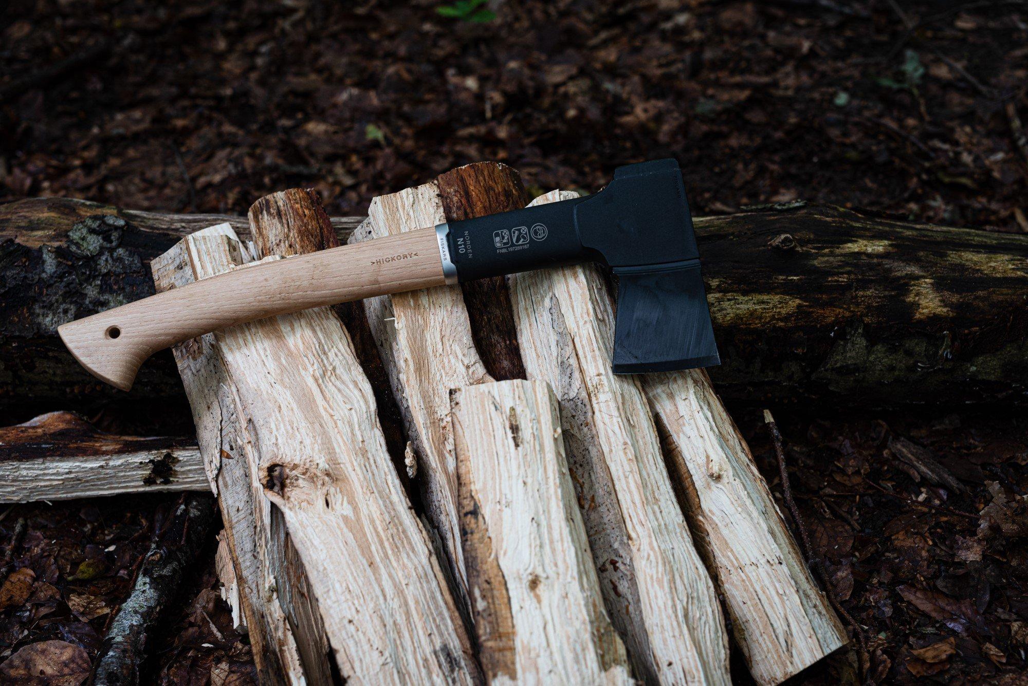 De Fiskars Norden-bijl lijkt totaal niet op de ‘standaard’ Fiskars-bijl. Het heeft een sterk metalen bijlkop, maar de handgreep is nieuw. Fiskars besloot een handgreep te gebruiken dat volledig is gemaakt van Amerikaans hickory-hout. Hickory is erg hard, stijf, compact en schokbestendig. Er zijn een aantal soorten hout die sterker zijn dan hickory en soorten die harder zijn. De combinatie van sterkte, taaiheid, hardheid en stijfheid komt echter in geen enkele andere houtsoort voor. Het is een fijne upgrade en brengt de bijl naar een geheel nieuw niveau. Het uiteinde van de handgreep heeft een mooie knop die ervoor zorgt dat de bijl nooit uit je hand glijdt.